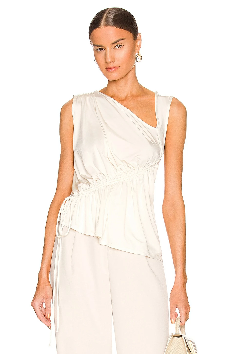 - Asymmetric styling with front drawstring detail